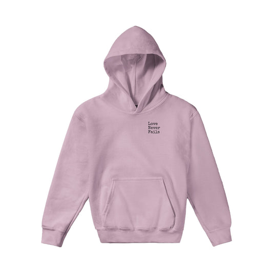 Love Never Fails Kids Pullover Hoodie (White Font)